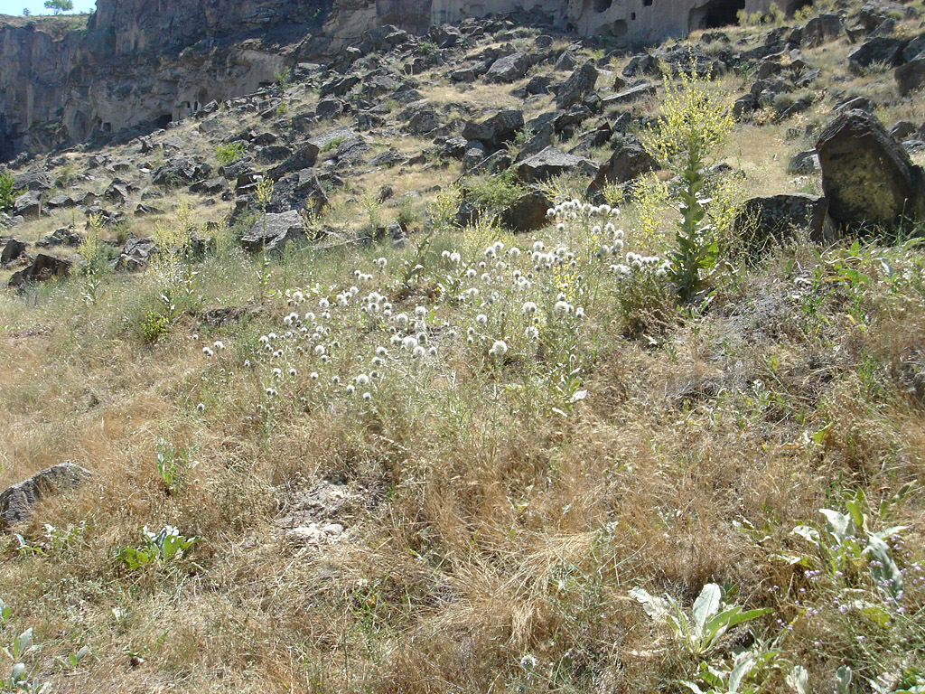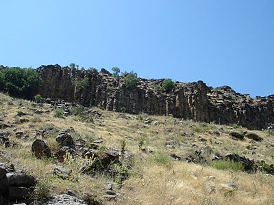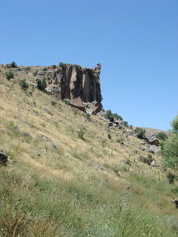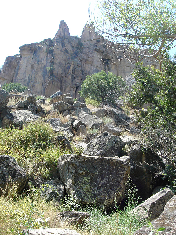 絶壁と小川の間の枯れ草の傾斜地には1、2メートルはあろうかという石がたくさん転がっていた。