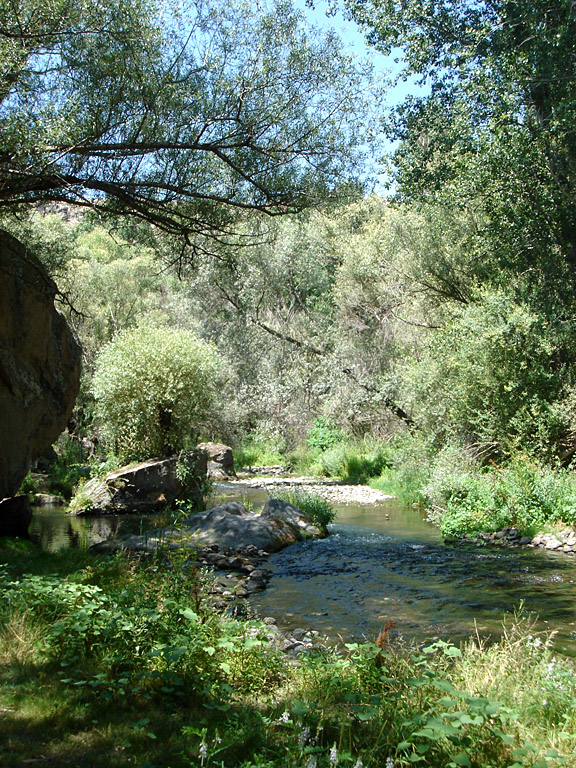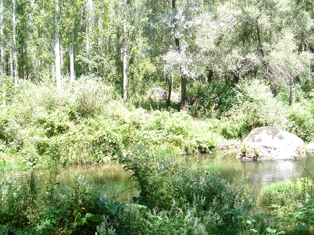 木陰の場所を通り過ぎていくと、目の前に広がったのは、小川の右側が森林で、左側が荒れ野の風景だった。