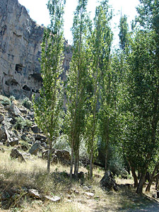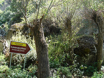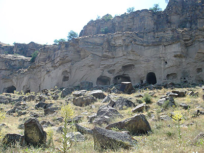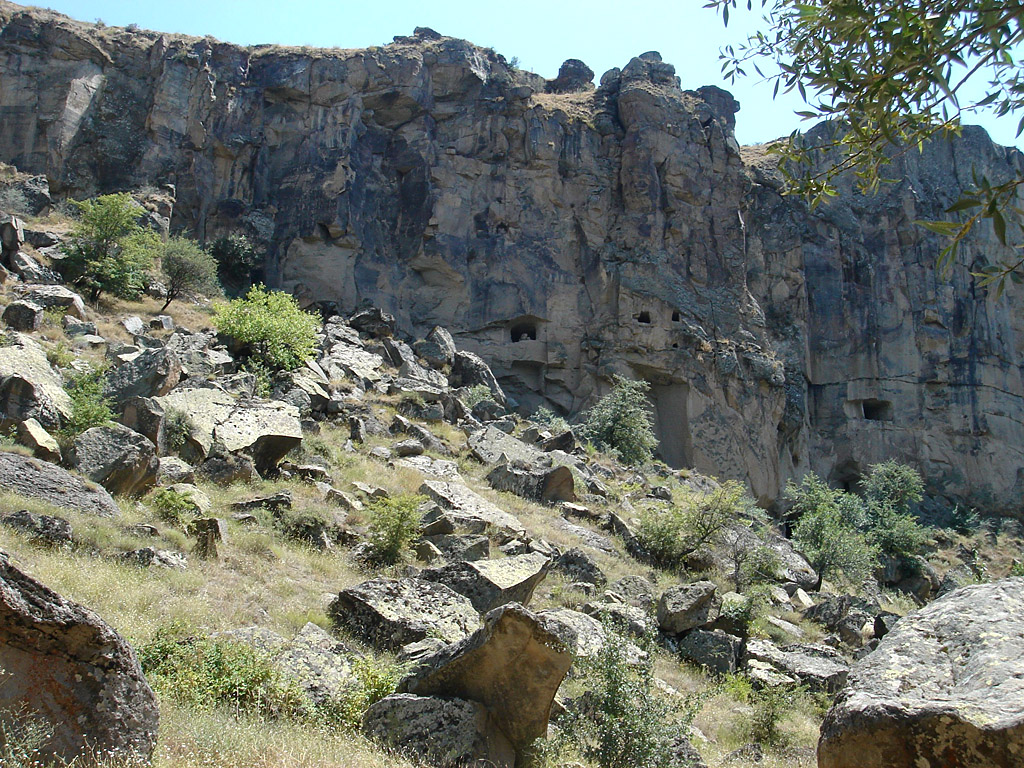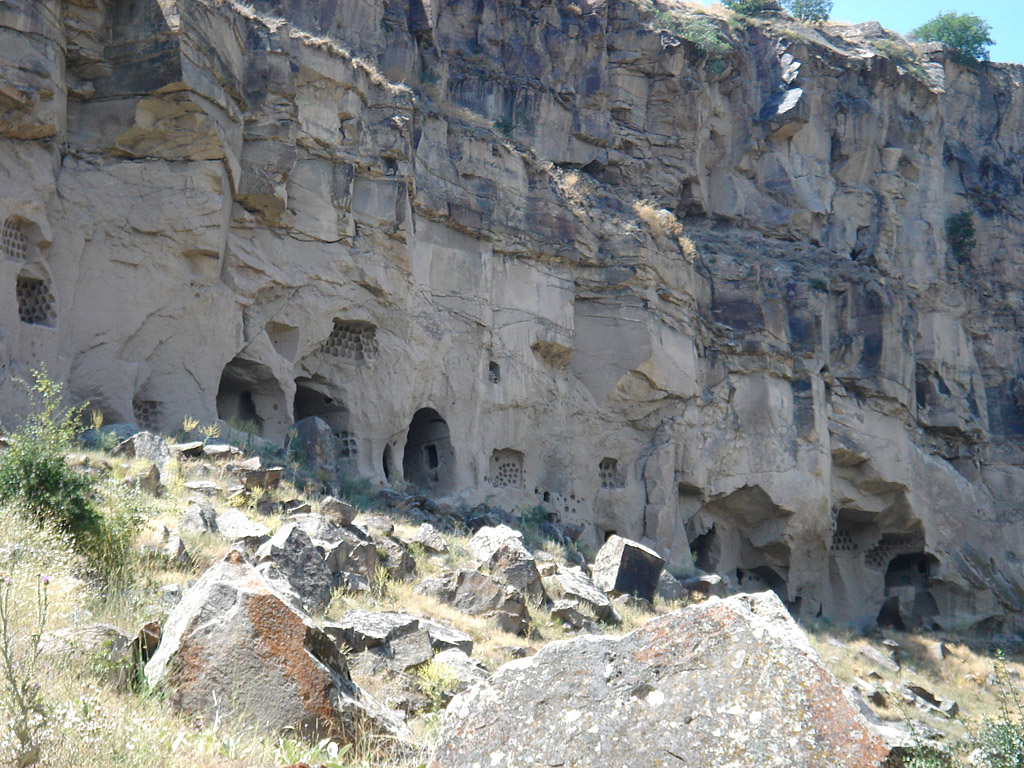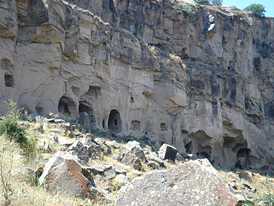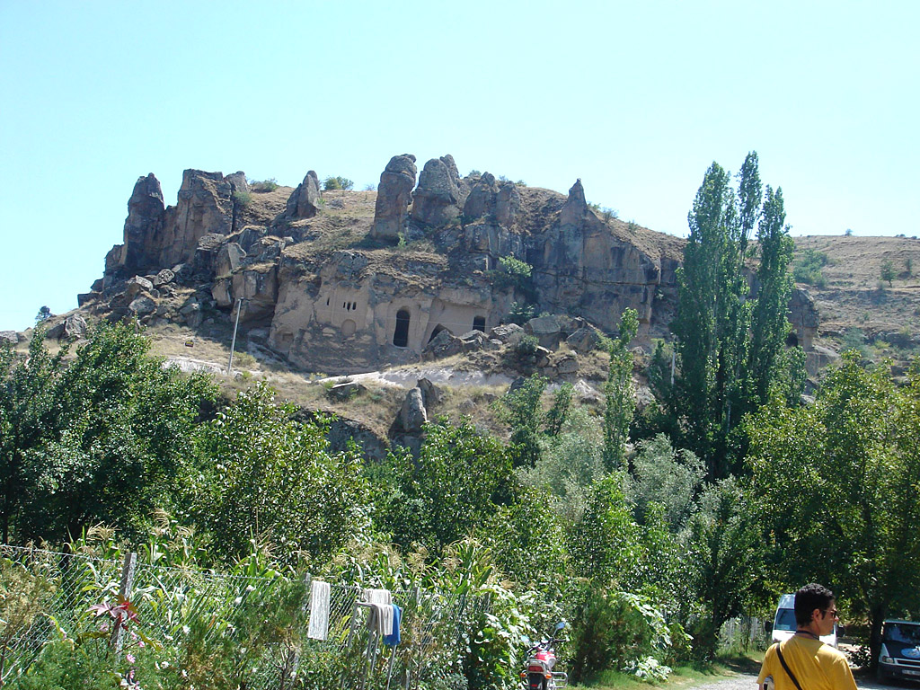 左側の絶壁の表面にはたくさんの洞窟教会の窓があった。
