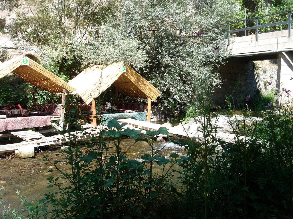 私は息子に小川の水上にあつらえられた小さな茅葺き小屋のそばで写真を撮ってくれるようにたのんだ。