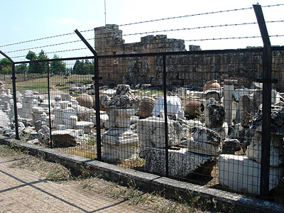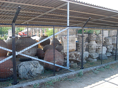 考古学博物館のそばの道路はものすごく暑い。鉄のフェンスの向こうの博物館の敷地には、ローマ遺跡から発掘された石材が置かれている。