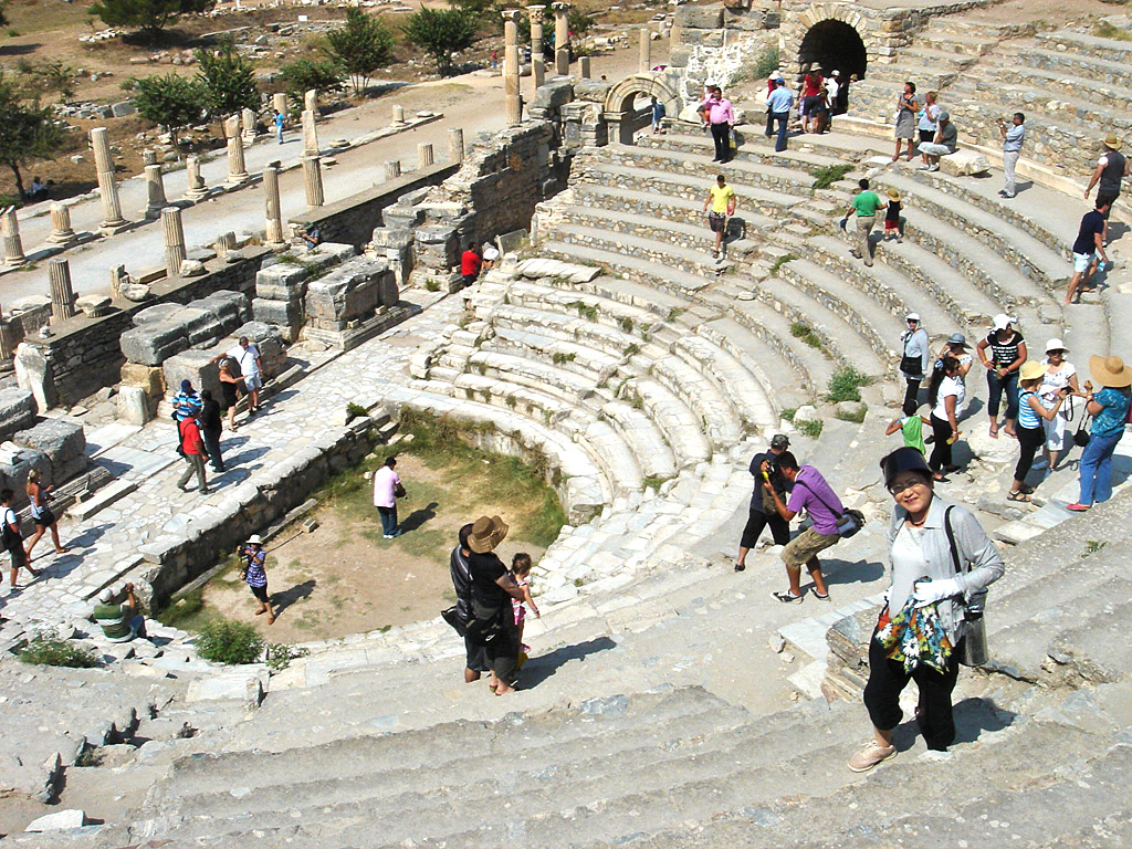 彼のお説教が止まった。そのあとで私たちは、ほかの観光客が三々五々集まりだした劇場の下に一緒に向かった。