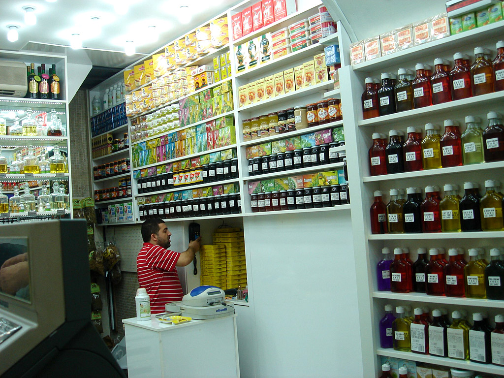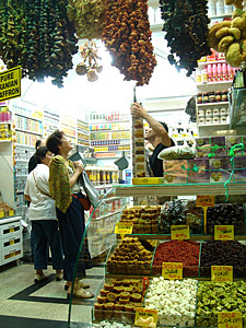 私は足を止めて、店の前の石畳に置かれた商品棚に積まれたたくさんの菓子、果物の砂糖煮などを見た。どの菓子類も1キロいくらと表示されている。